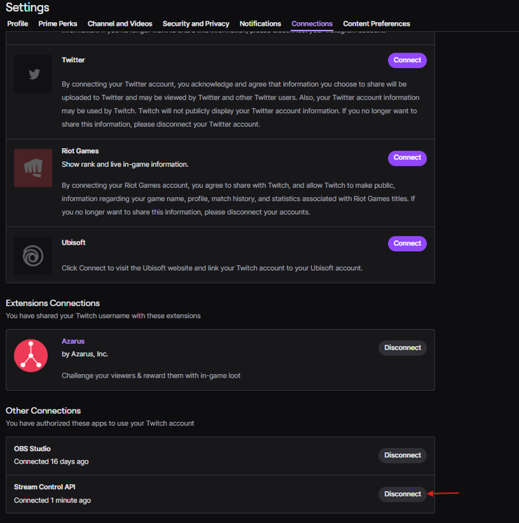 and by cutting the connection on Twitch settings